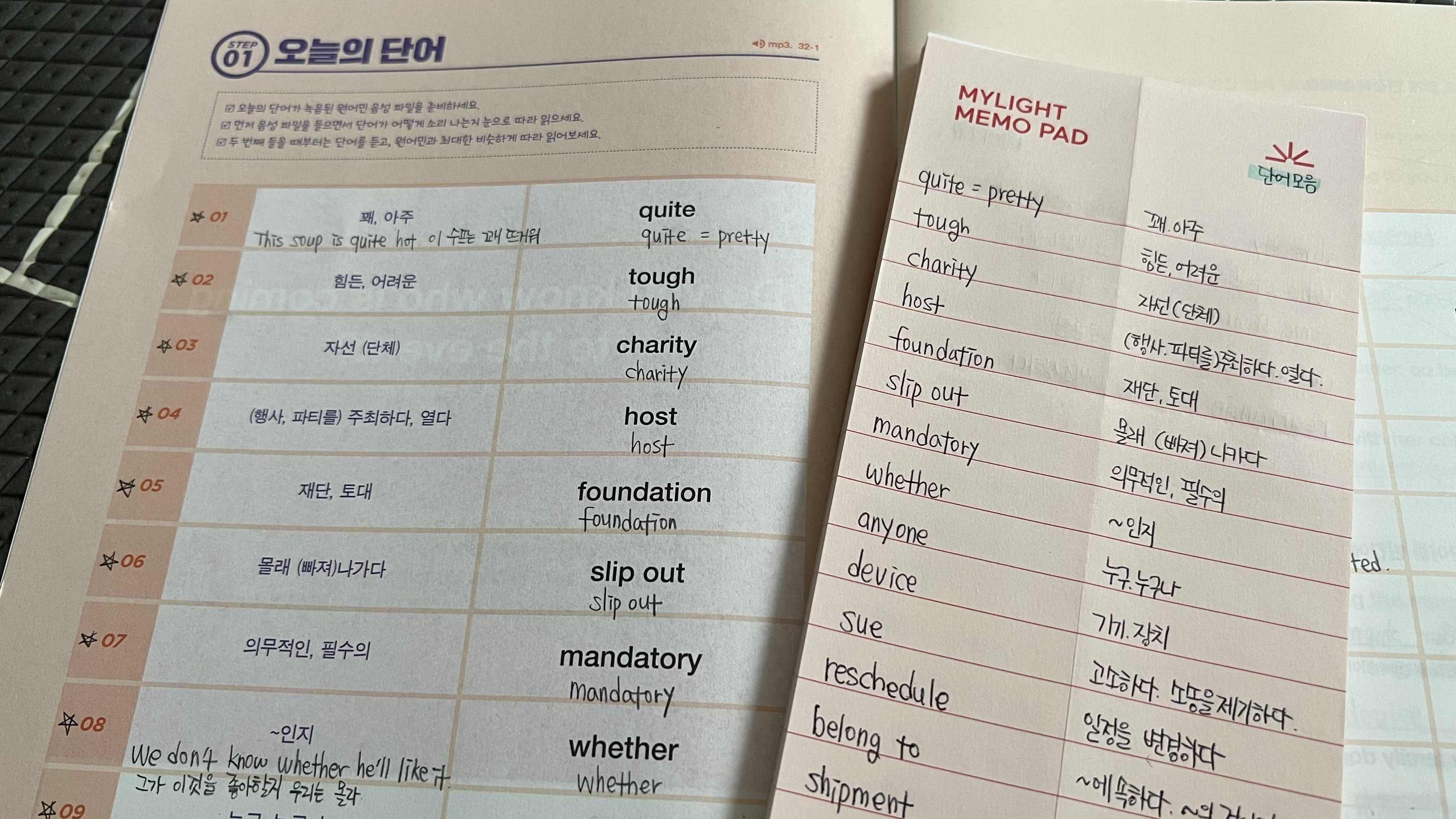 이번 주 단어... 모르는 게 심각하게 많아서 당황했다. 보통 메모패드에 3~5개 정도 새로운 단어를 정리하는 것 같은데 이번 주에는 거의 전부 다 받아적는 수준이었다. 영어공부를 하면 할수록 단어, 어휘를 많이 아는 것의 중요성을 깨닫게 된다. 열심히 외워야지!