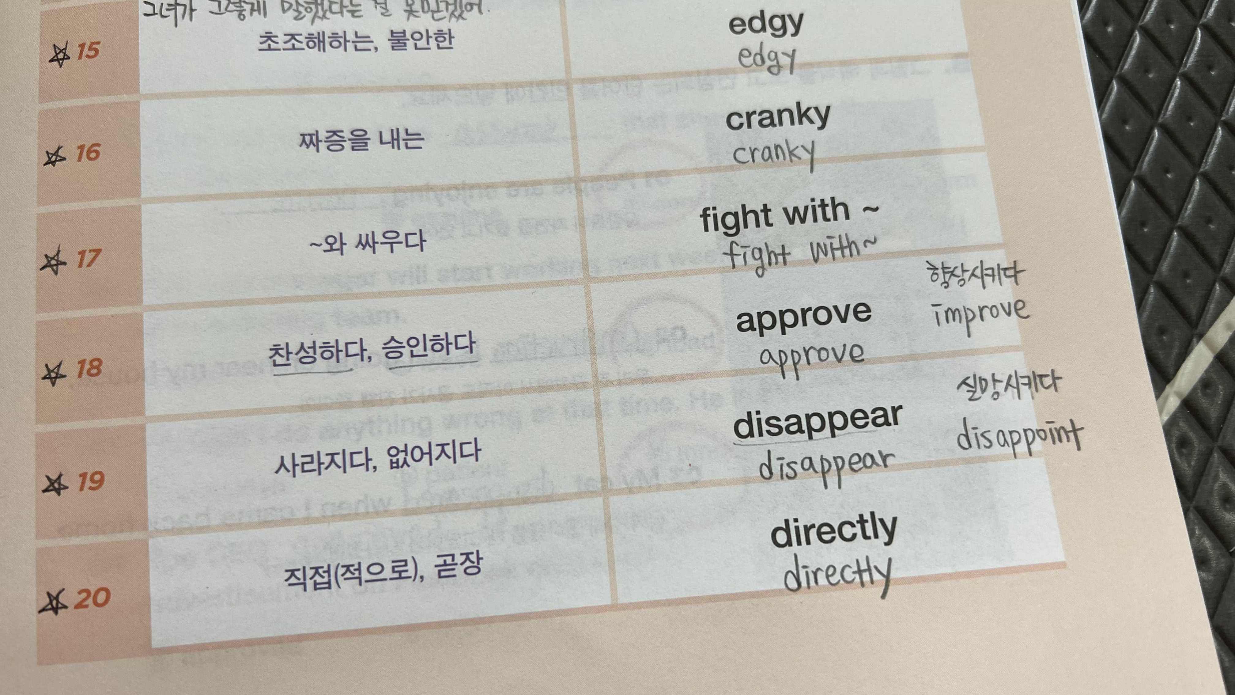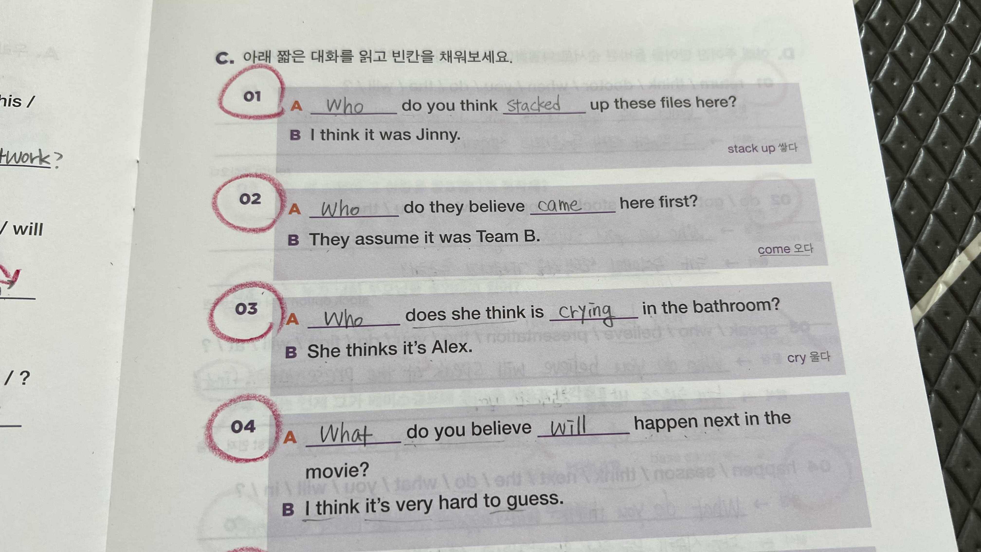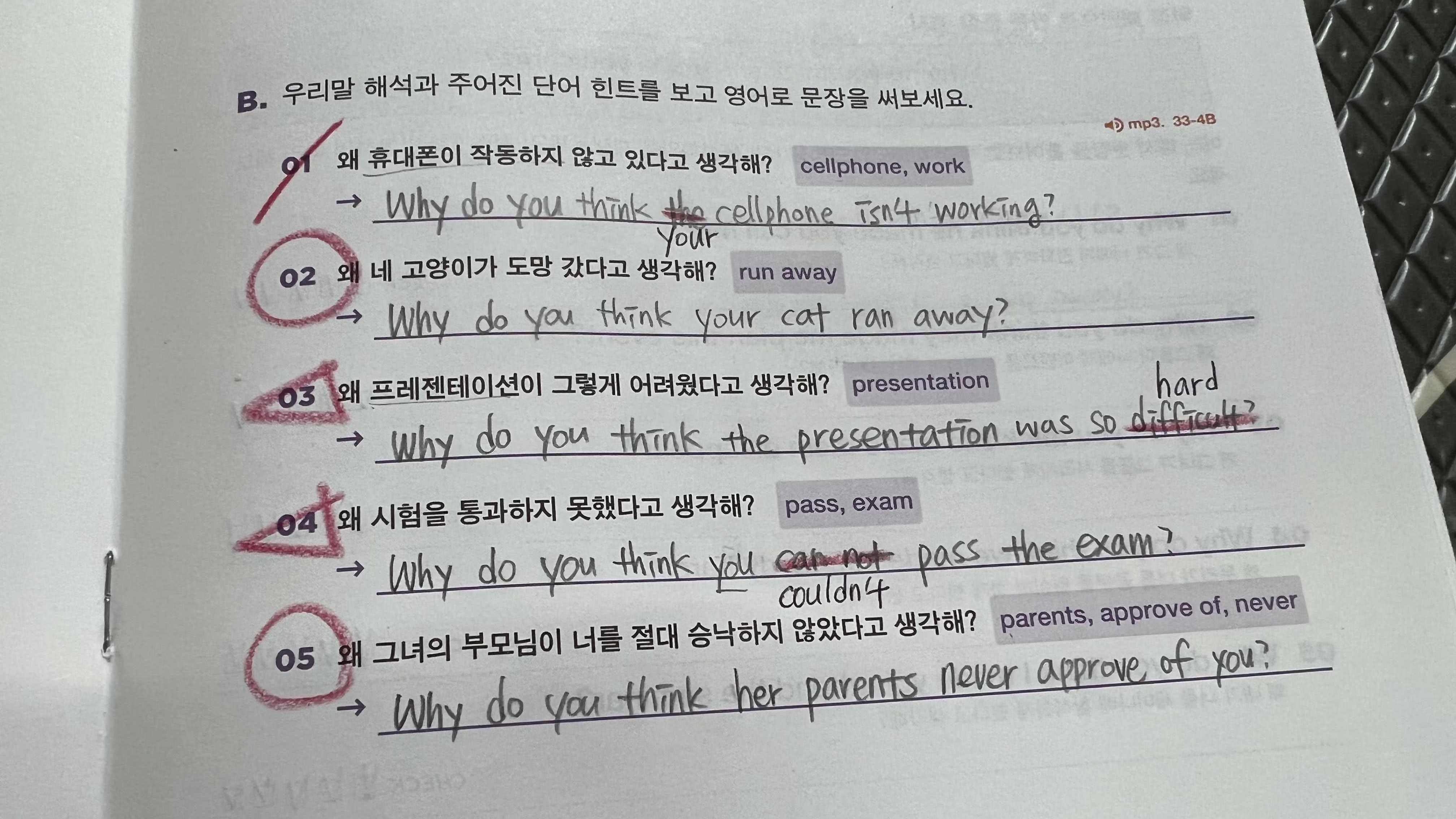 문제를 풀어보며 개념을 좀 더 확실하게 이해할 수 있었다. 그리고 채점을 할 때에 한가지 답안만 나와 있어서 긴가민가 하고 헷갈리는 문제들이 있다. 예를 들면 '어려웠다고'를 영작할 때에 나는 difficult 단어를 썼는데 답안에는 hard 라고 나와 있었다. 또 '시험에 통과하지 못했다'를 영작할 때에 나는 can not pass the exam 이라고 썼는데 답안에는 can not 대신 couldn't 라고 나와 있었다. 이런 건 맞는 것인지 틀린 것인지 채점할 때 혼란스러운데, 이런 부분은 조금 아쉽다.