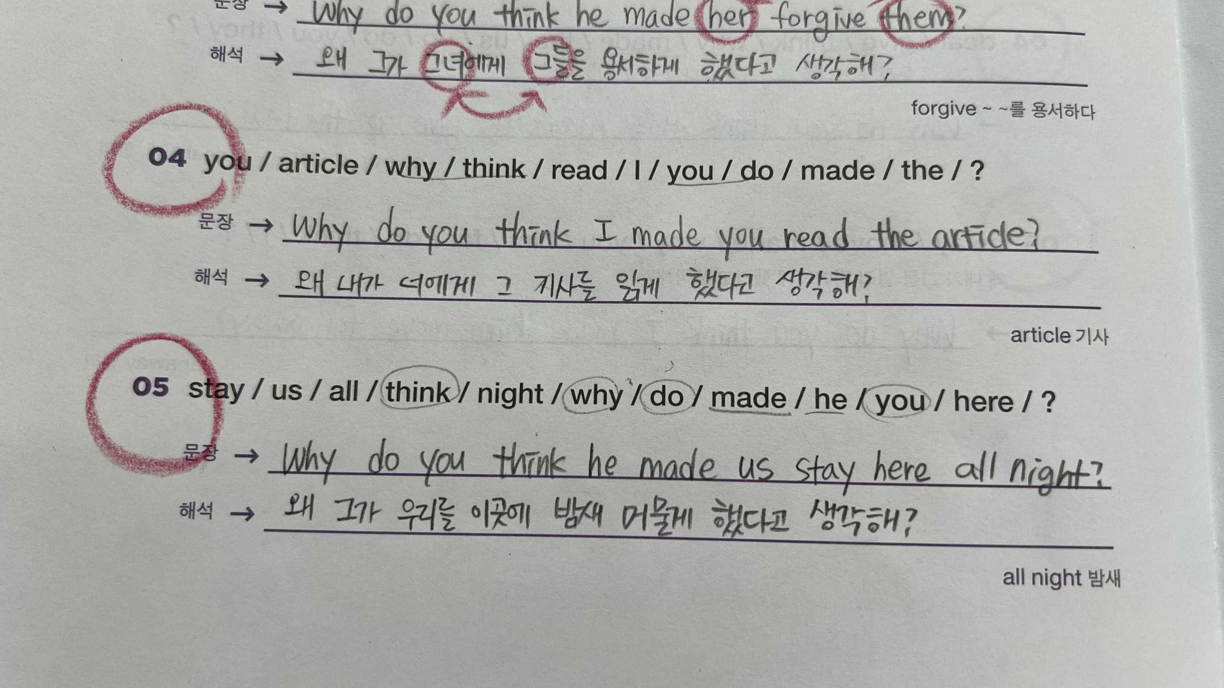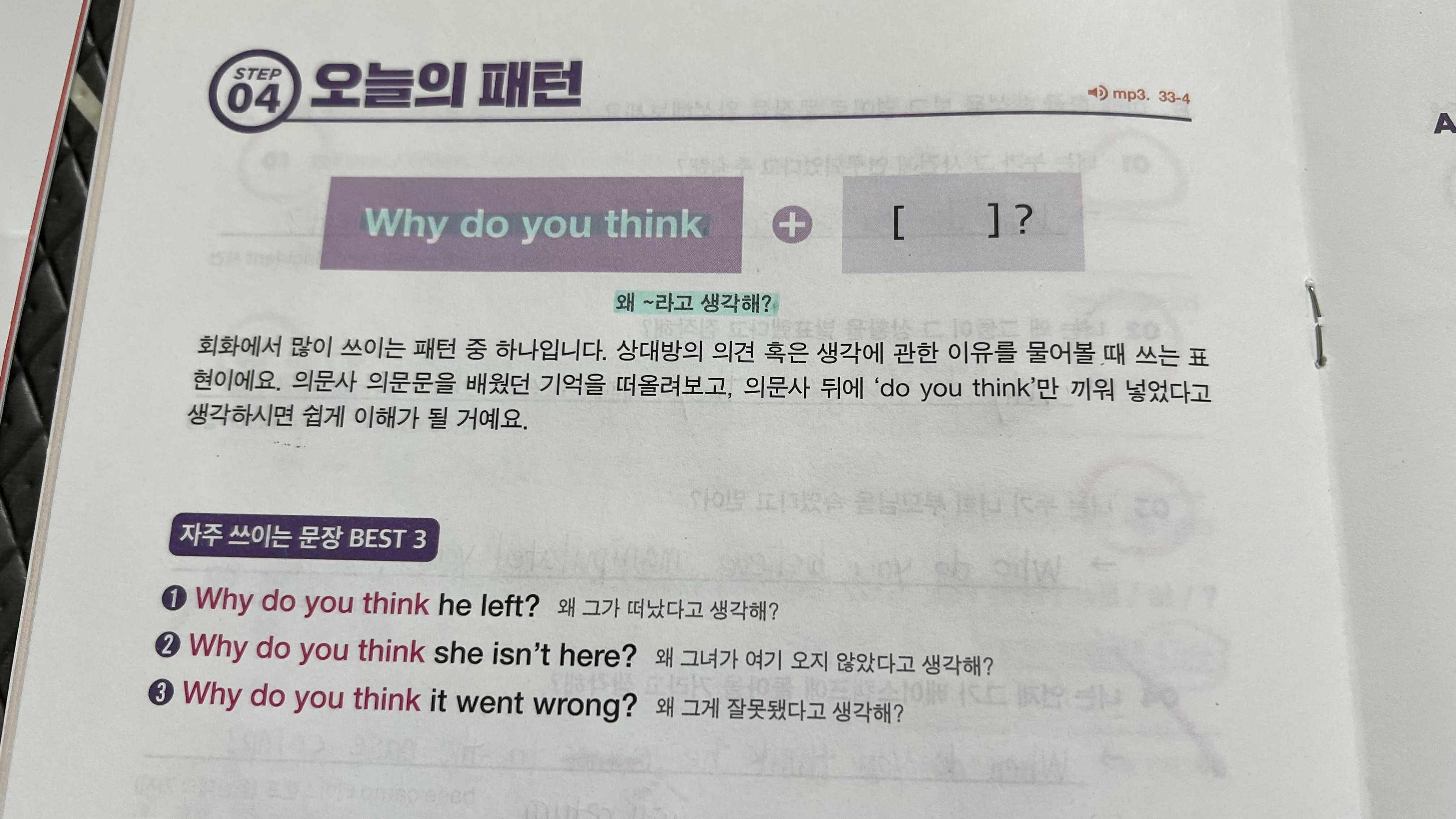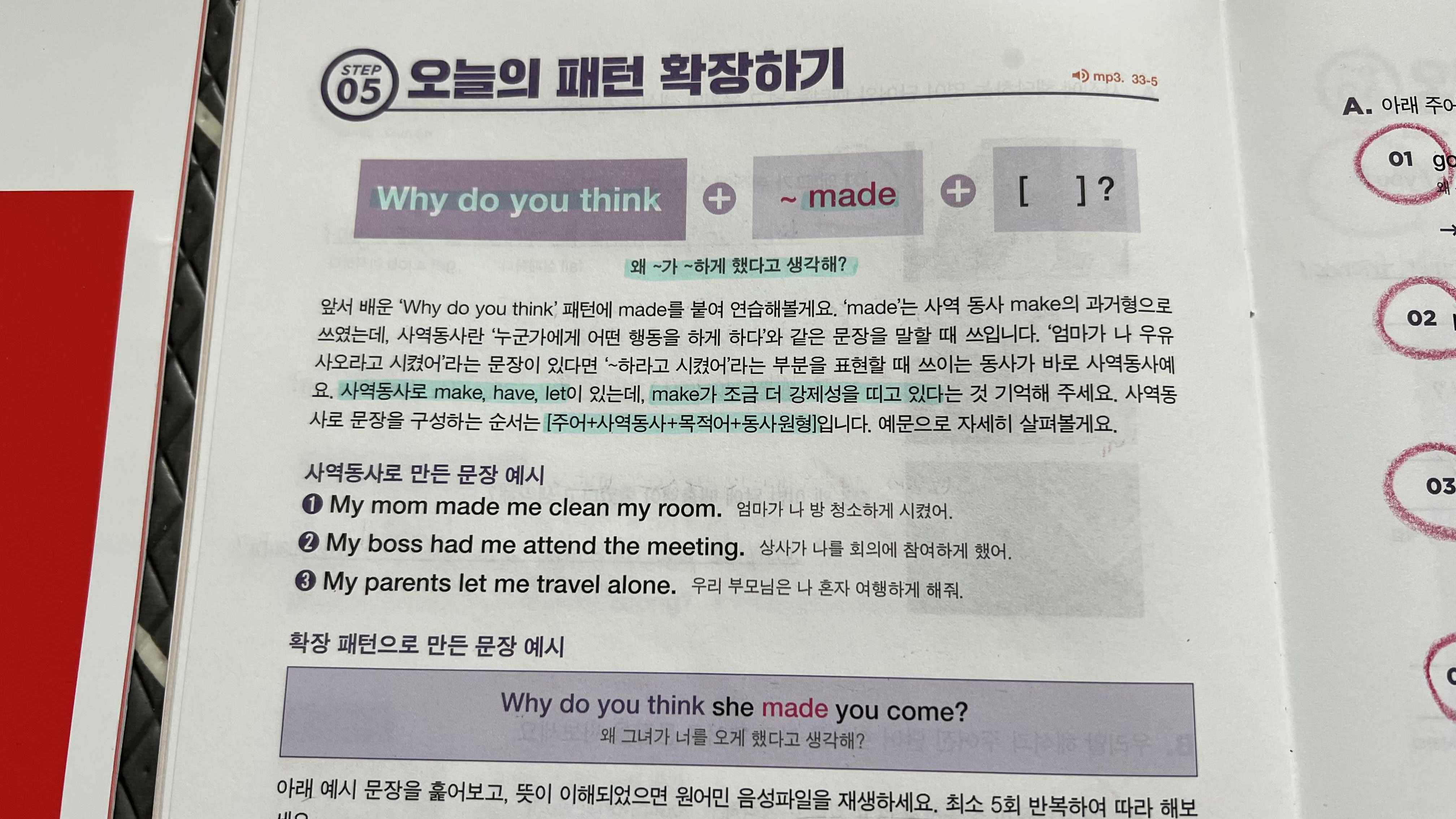 오늘의 패턴에서는 Why do you think~? 왜 ~라고 생각해? 하는 표현과 Why do you think ~ made ~? 왜 ~가 ~하게 했다고 생각해? 라는 확장 표현을 배웠다. 사역동사의 개념에 대해서도 추가로 알게 되어 뜻깊은 시간이었다.