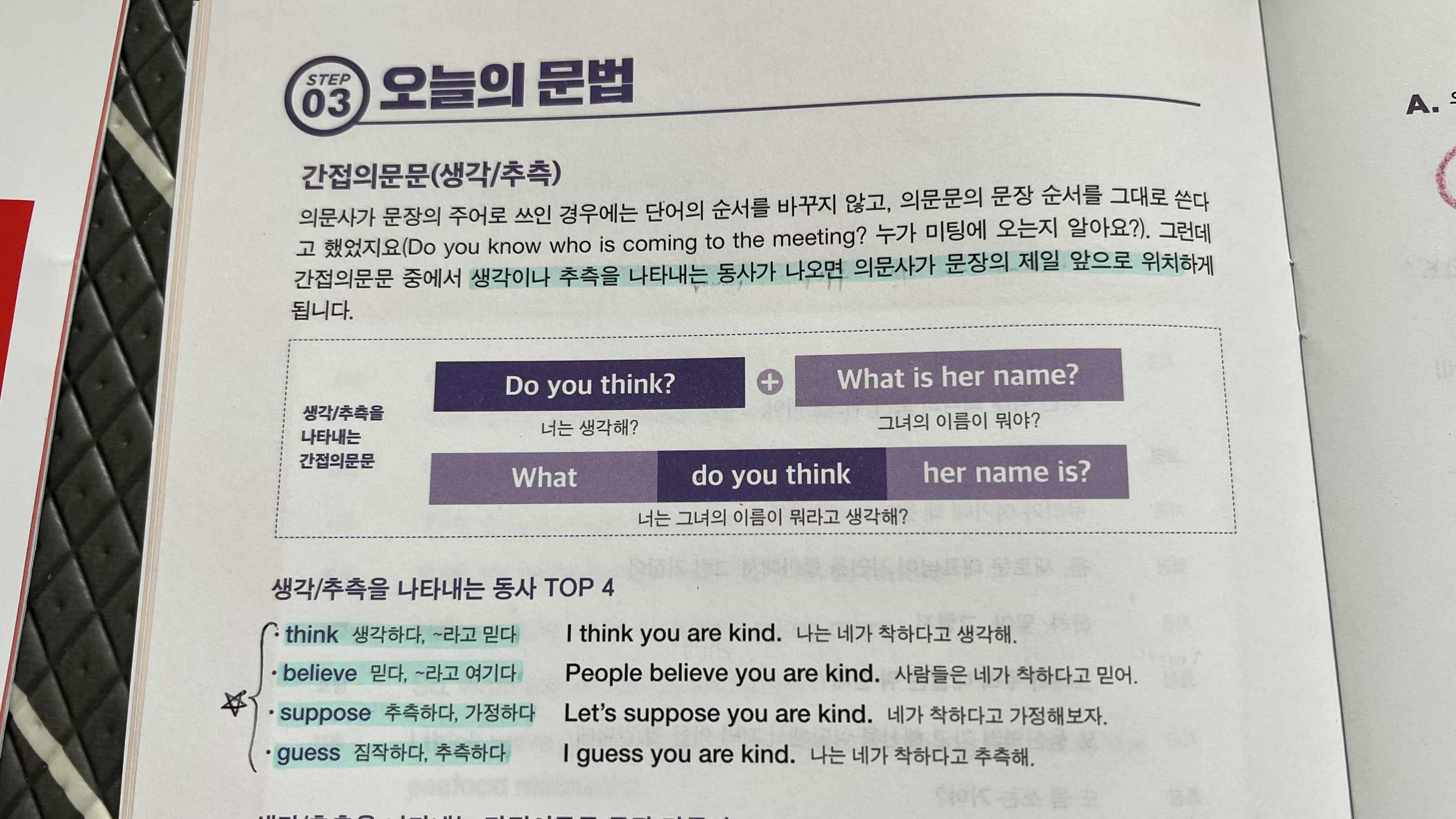 33주차 교재의 간접의문문은 생각/추측의 의미로 사용되는 패턴에 한정되어 있었다. 생각/추측을 나타내는 동사는 아래와 같은 것들이 있는데, 간접의문문에서 이러한 동사들이 나오면 의문사가 문장의 제일 앞에 위치하게 된다고 한다.