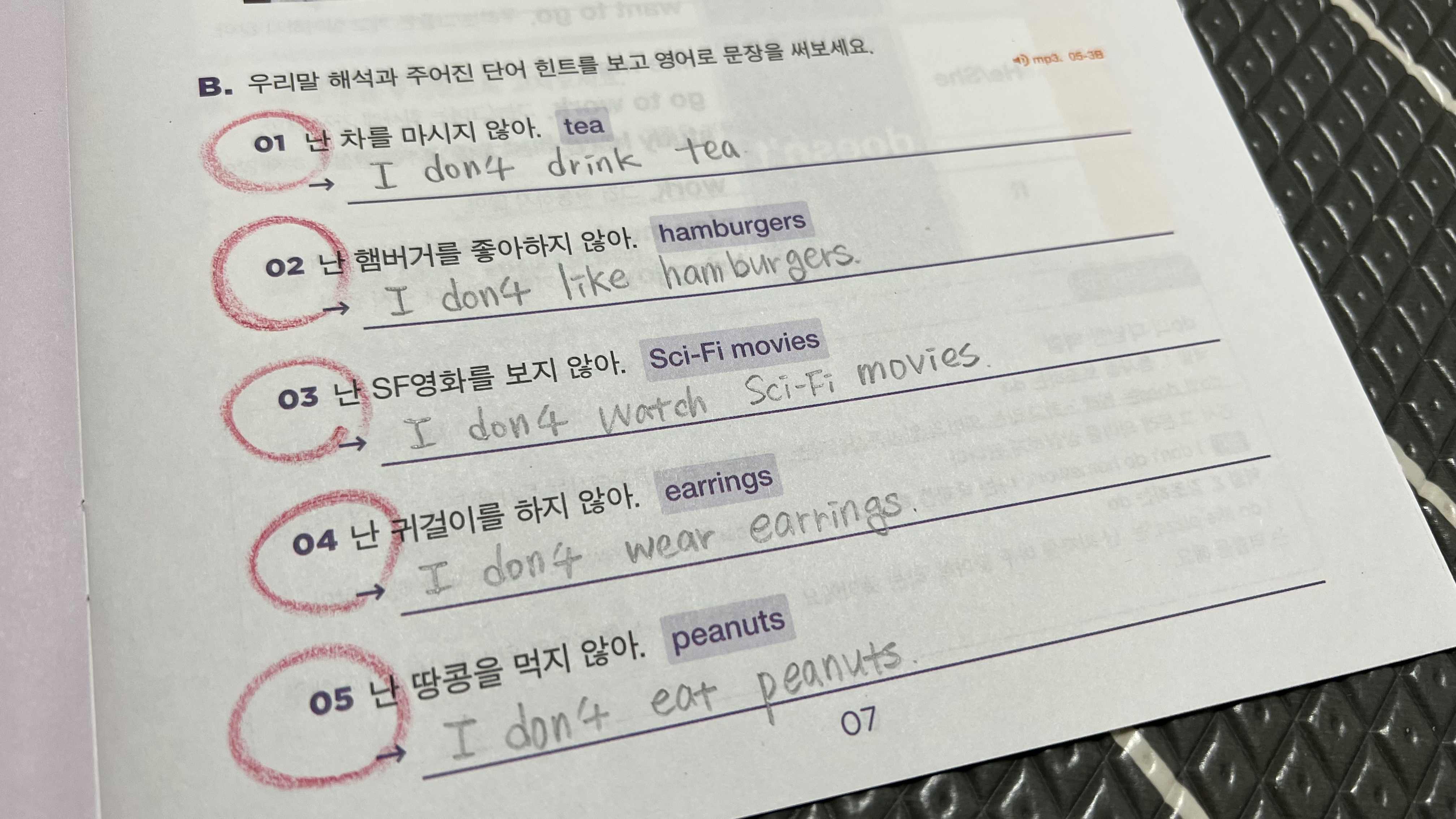 내가 가장 좋아하는 문제풀이 시간이다. 사각사각 연필 소리도 좋고, 문장 패턴을 익히는 데에도 도움이 많이 된다. 이렇게 5주차 가벼운 영어 학습지도 완료! 갈길이 멀지만 단계를 밟아 잘 나아가고 있다. 앞으로도 화이팅이다.