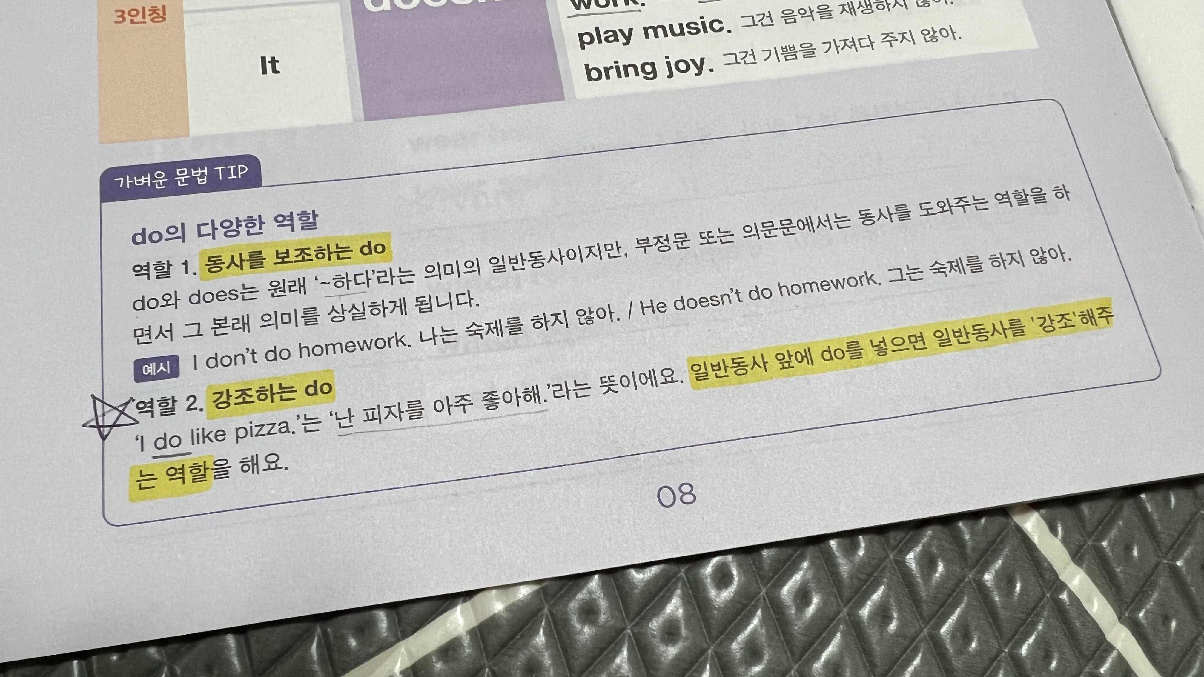 do가 동사를 보조하는 역할 외에 강조하는 역할로도 사용된다고 한다. 예를 들어 'I do like pizza' 라고 하면 그냥 'I like pizza.' 하는 것보다 더 강조의 의미가 된다. 한국어로 해석하면 '나는 피자를 정말 좋아해.'가 되는 것이다. 새롭게 알게 된 사실이라 형광펜으로 밑줄도 긋도 메모패드에 따로 적어두었다.