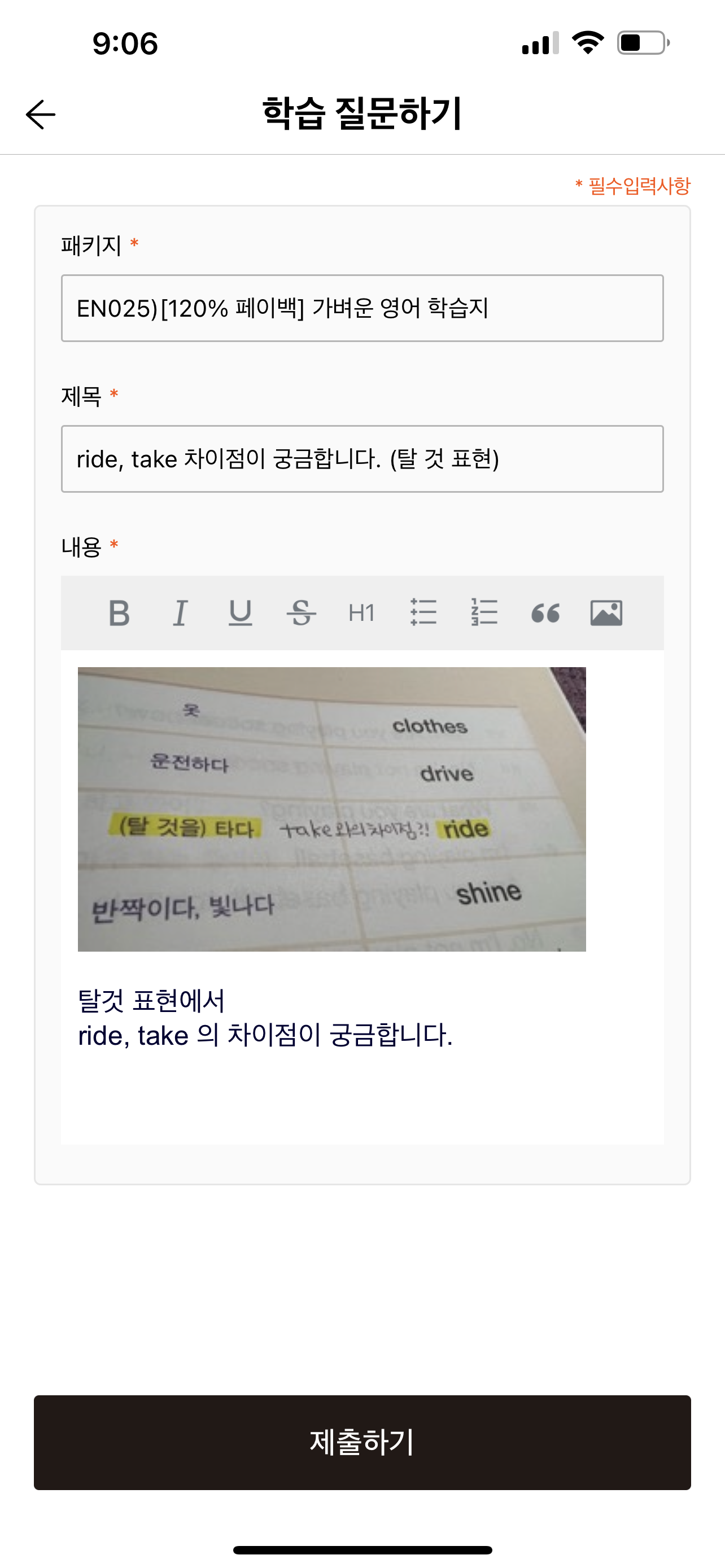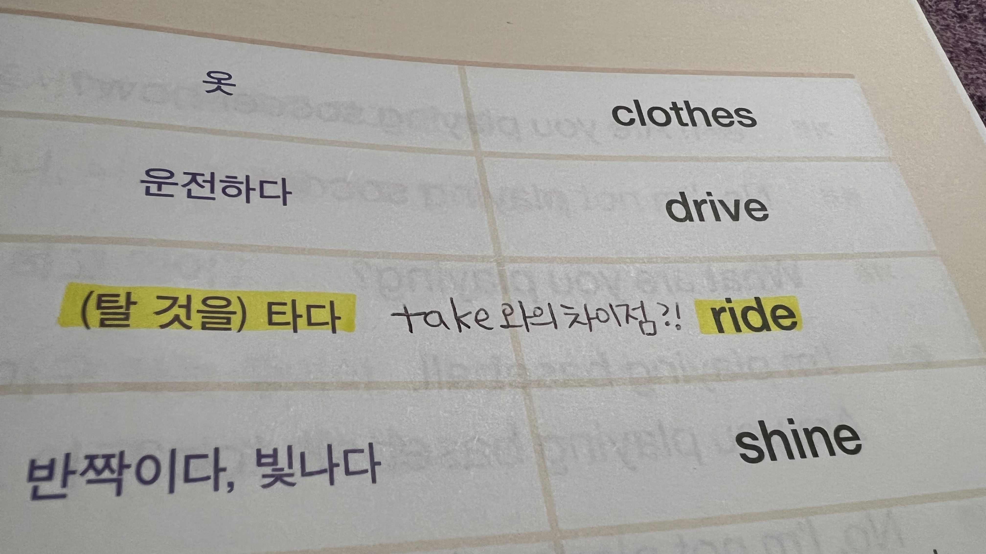단어 공부를 하다가 ride(타다) 라는 단어를 보았는데 take와의 차이점이 궁금해서 가벼운 학습지 어플에 질문을 했다. 그리고 다음 날 답변을 받을 수 있었다. take와 ride는 같은 의미로 사용할 수 있으며, 교차적으로 사용할 수도 있다. 하지만 ride를 사용할 수 있는 명사, take를 사용할 수 있는 명사가 정해져 있는 경우도 있다. 아래와 같은 명사들은 해당하는 동사를 사용하는 것이 좋다고 한다.