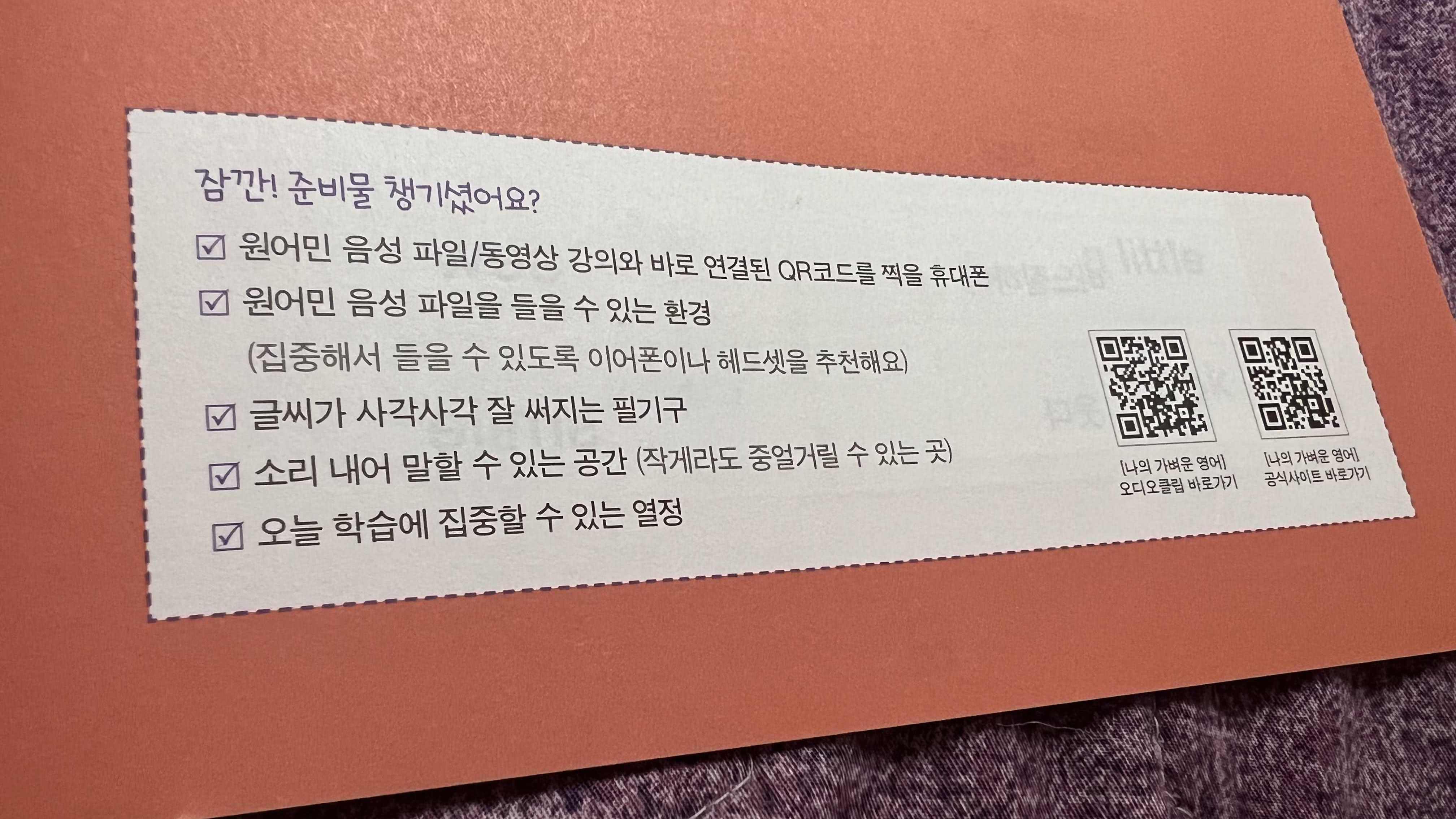 아! 그리고 이번 주차 공부의 수확... 표지 다음 페이지에 주제와 함께 큐알코드 하나가 인쇄되어 있다. 왼쪽 큐알코드를 인식하면 오디오클립 페이지로 이동이 가능하며, 더 쉽게 음원을 찾아 들을 수 있다. 가벼운 학습지 어플에서 MP3 음원에 찾아 들어가는 과정이 번거로웠었는데 이걸 이제서야 발견하다니... 하... 나 아직까지 뭐한거지=_= 이제라도 알게되어 정말 다행이다.