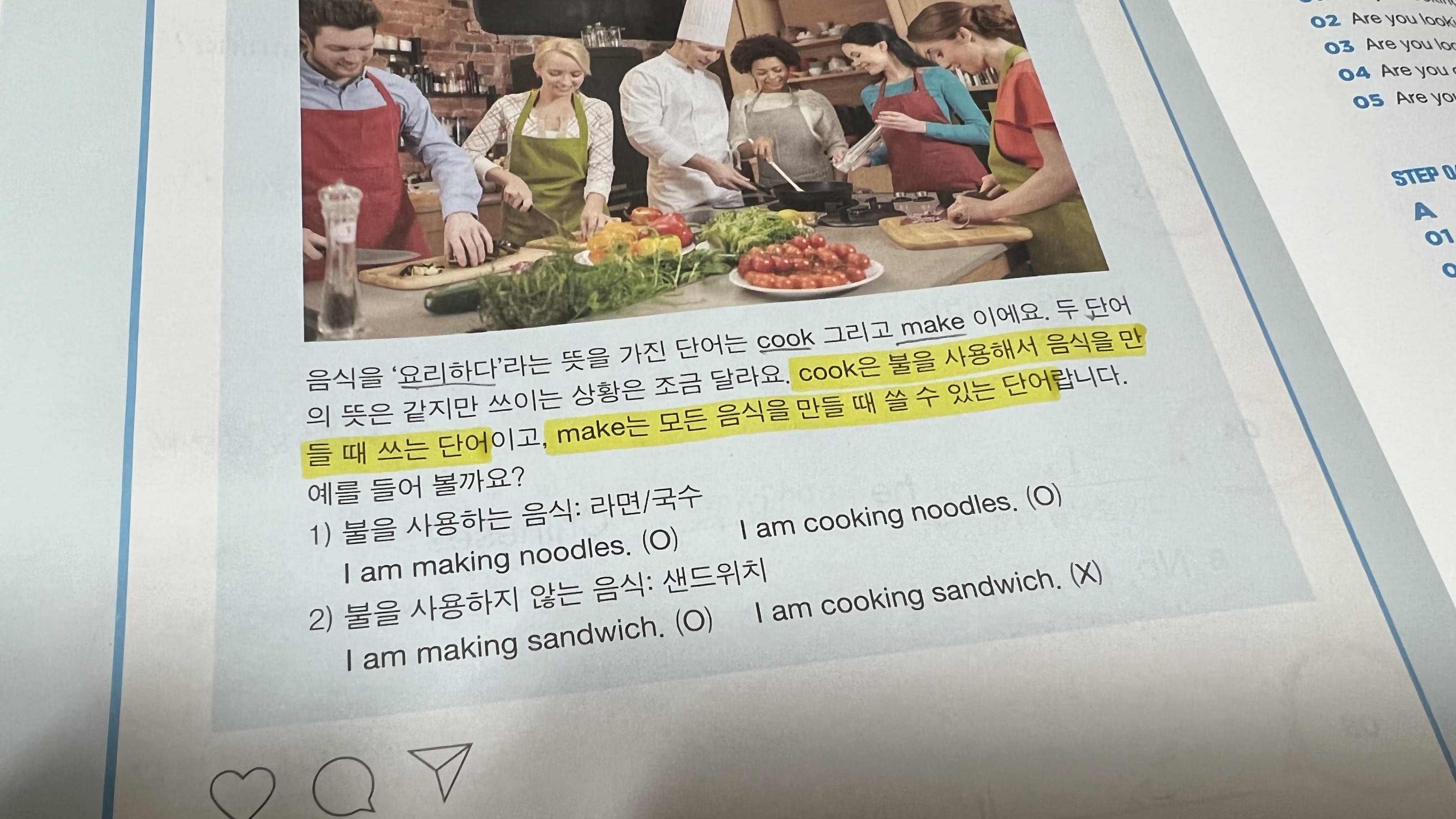 마지막 보너스 페이지에서는 cook과 make의 차이점에 대해서 배울 수 있었다. 불을 사용해서 음식을 만드는 것은 cook, 모든 음식을 만들 때 사용하는 것은 make라고 한다. 이런 유용한 정보~ 너무 좋다.