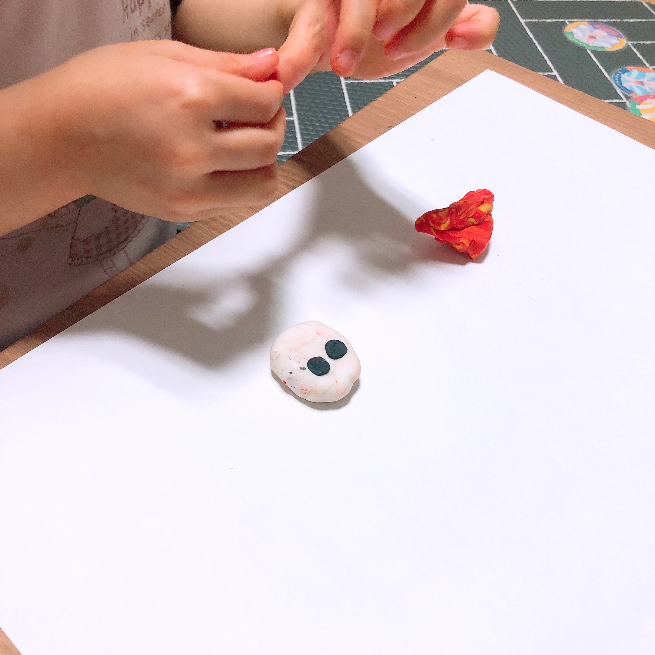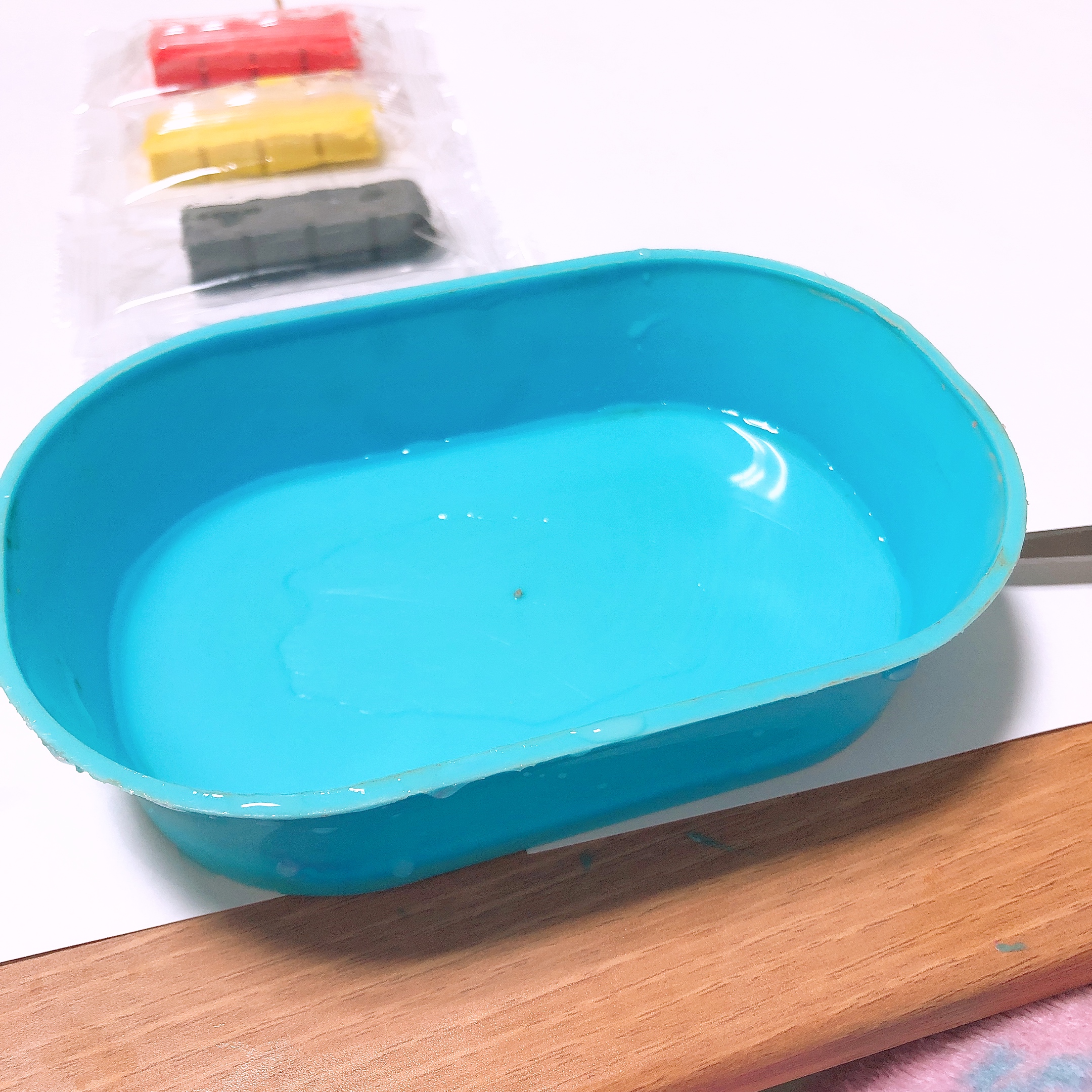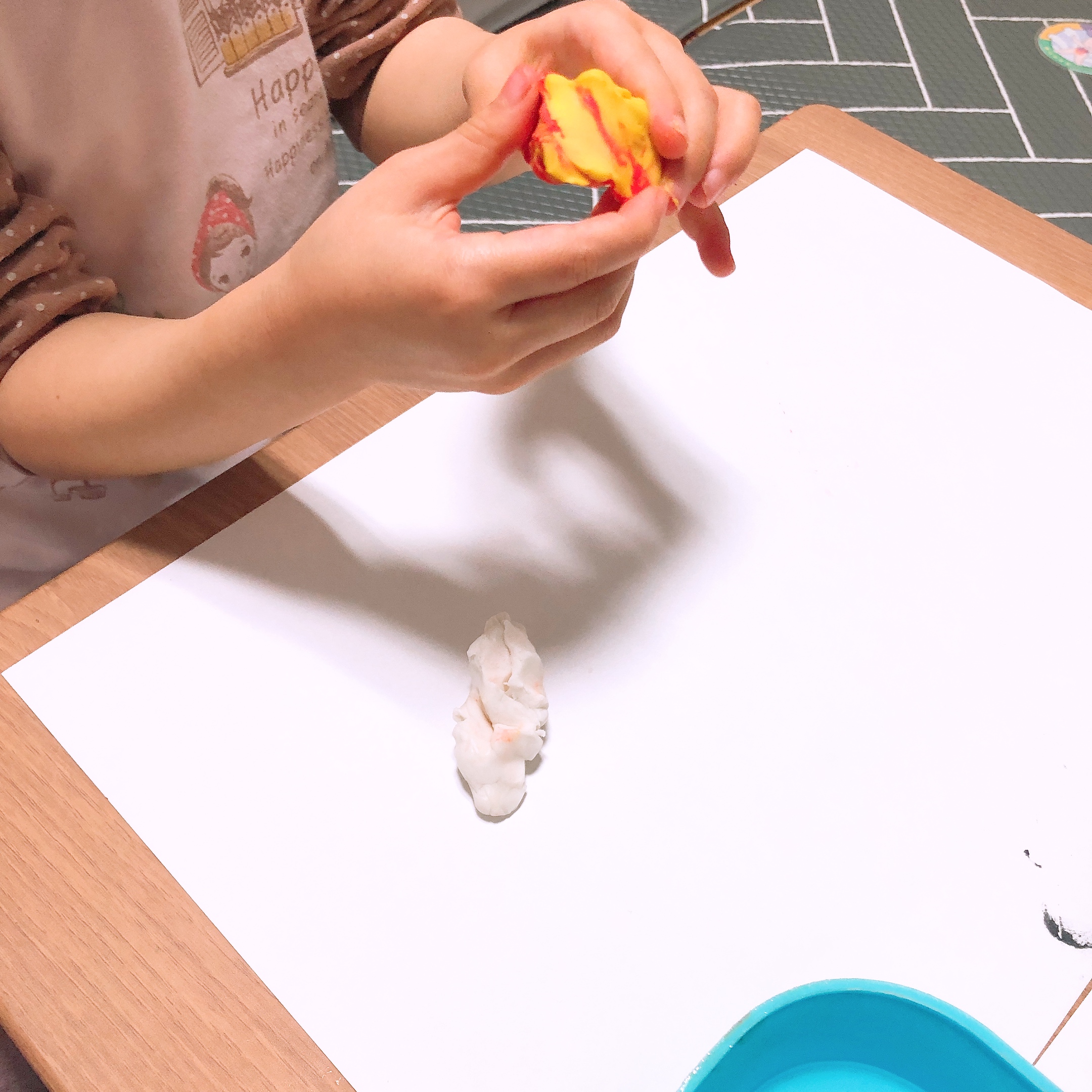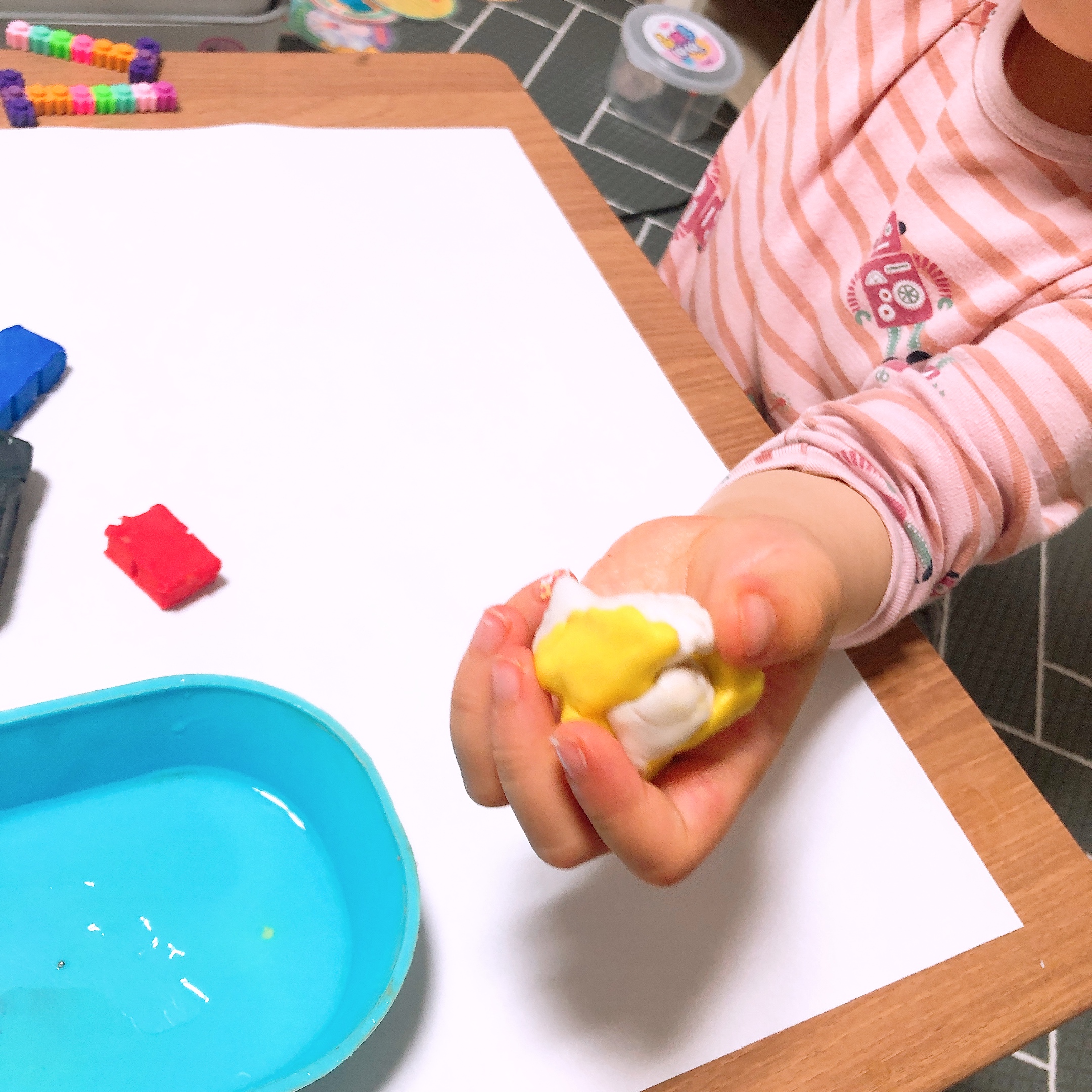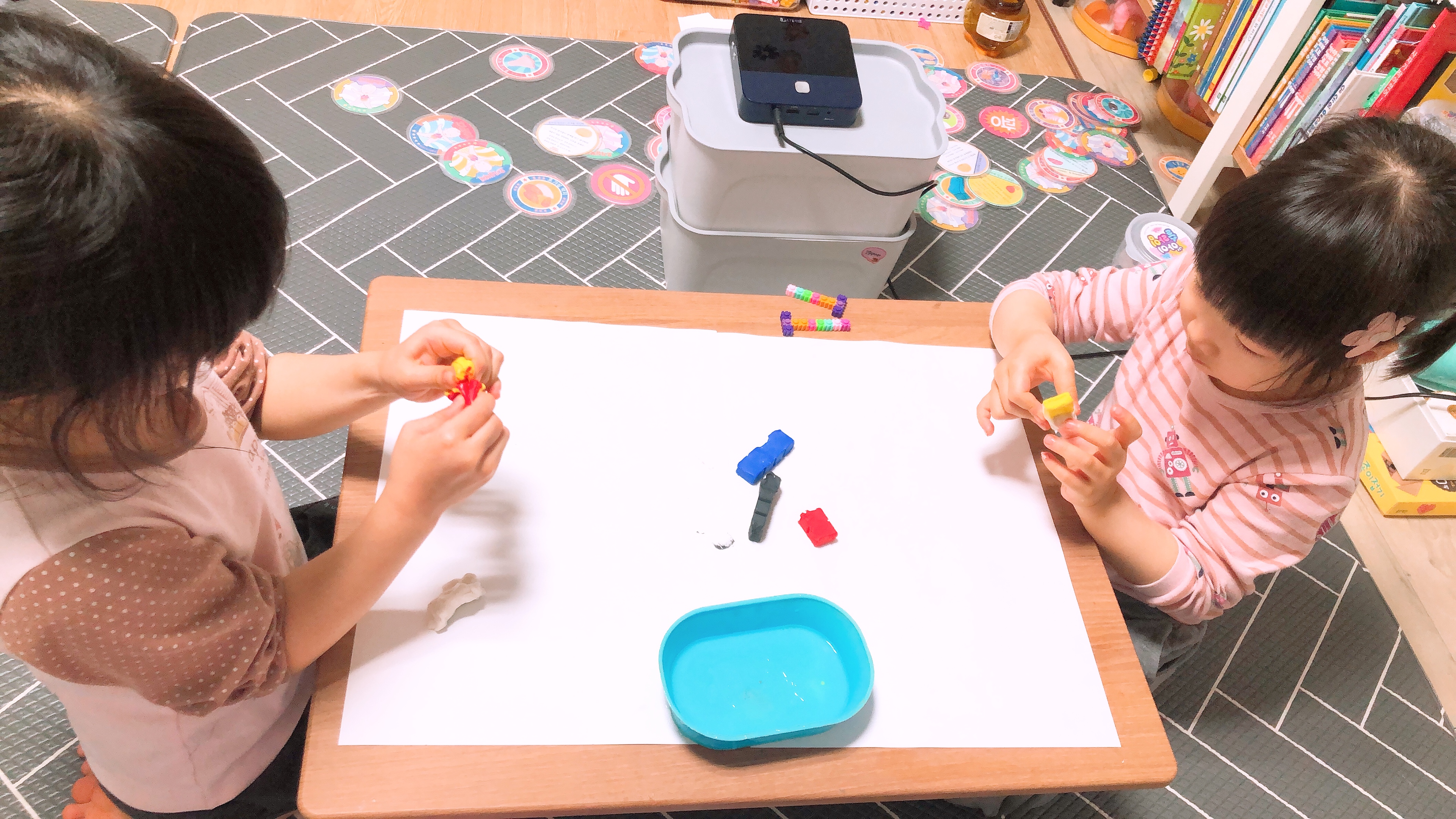 좌식 테이블 위에 미리 준비해 둔 종이를 깔고 비누반죽을 올려 두었다. 다른 색깔의 비누를 연결할 때 물을 조금 묻혀주면 비누끼리 잘 붙는다고 해서 물도 준비했다. 물이 너무 많으면 거품이 생겨버리니 만들기 전 아이들에게 물을 조금만 써서 붙여야 한다고 설명도 해 주었다. (분무기를 사용해도 편하다고 설명서에 나와있다.)