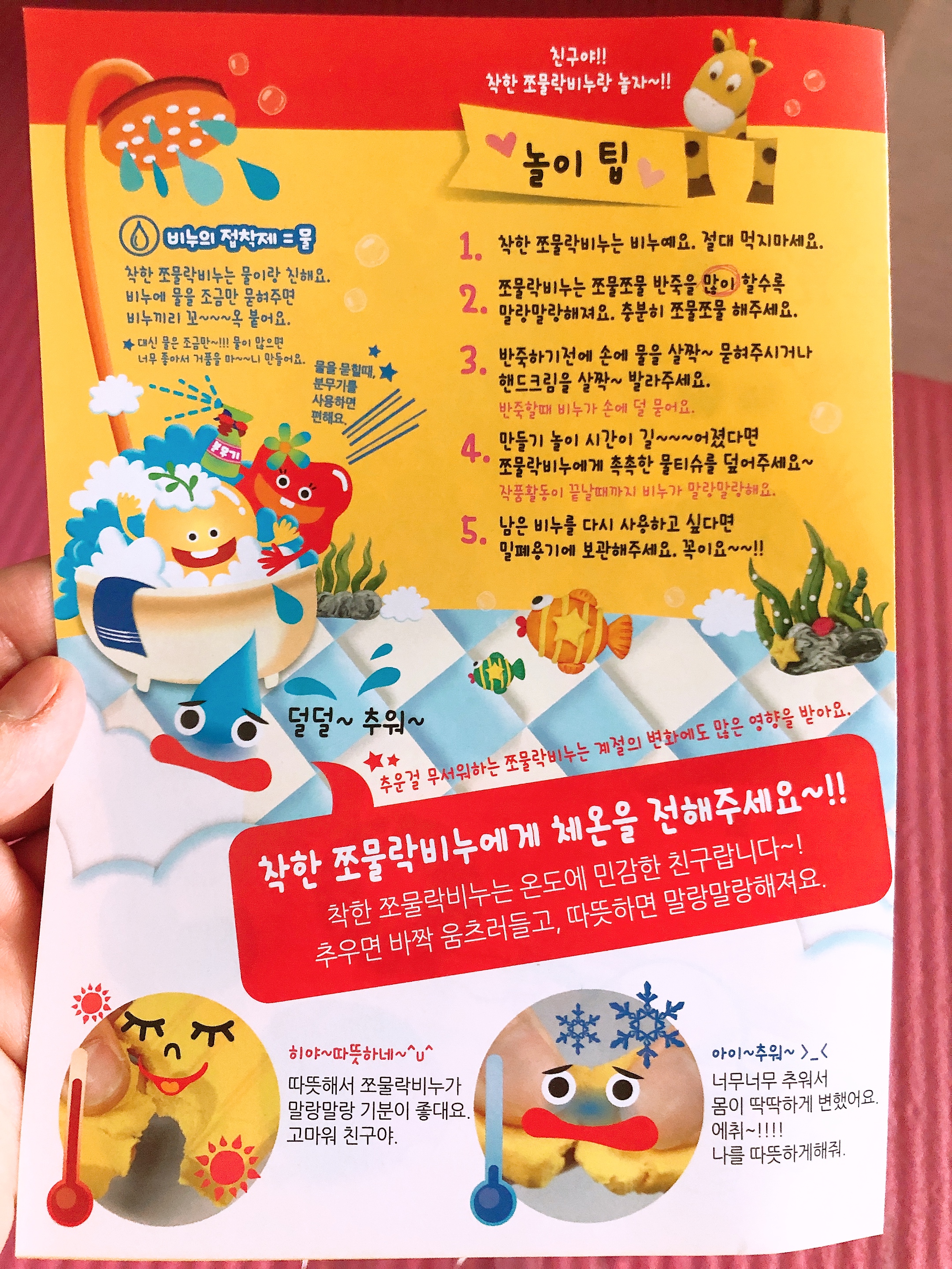 쪼물락비누 설명서에는 놀이 방법과 팁이 자세하게 설명되어 있었다. 추우면 바짝 움츠러들고 딱딱해지는 쪼물락비누를 손으로 반죽해주면 체온으로 인해 점점 말랑말랑해져 나중에는 클레이처럼 모양을 만들 수 있다. 만들기 놀이 시간이 길어졌다면 촉촉한 물티슈를 덮어 놓으면 말랑말랑함이 오랫동안 유지된다.
