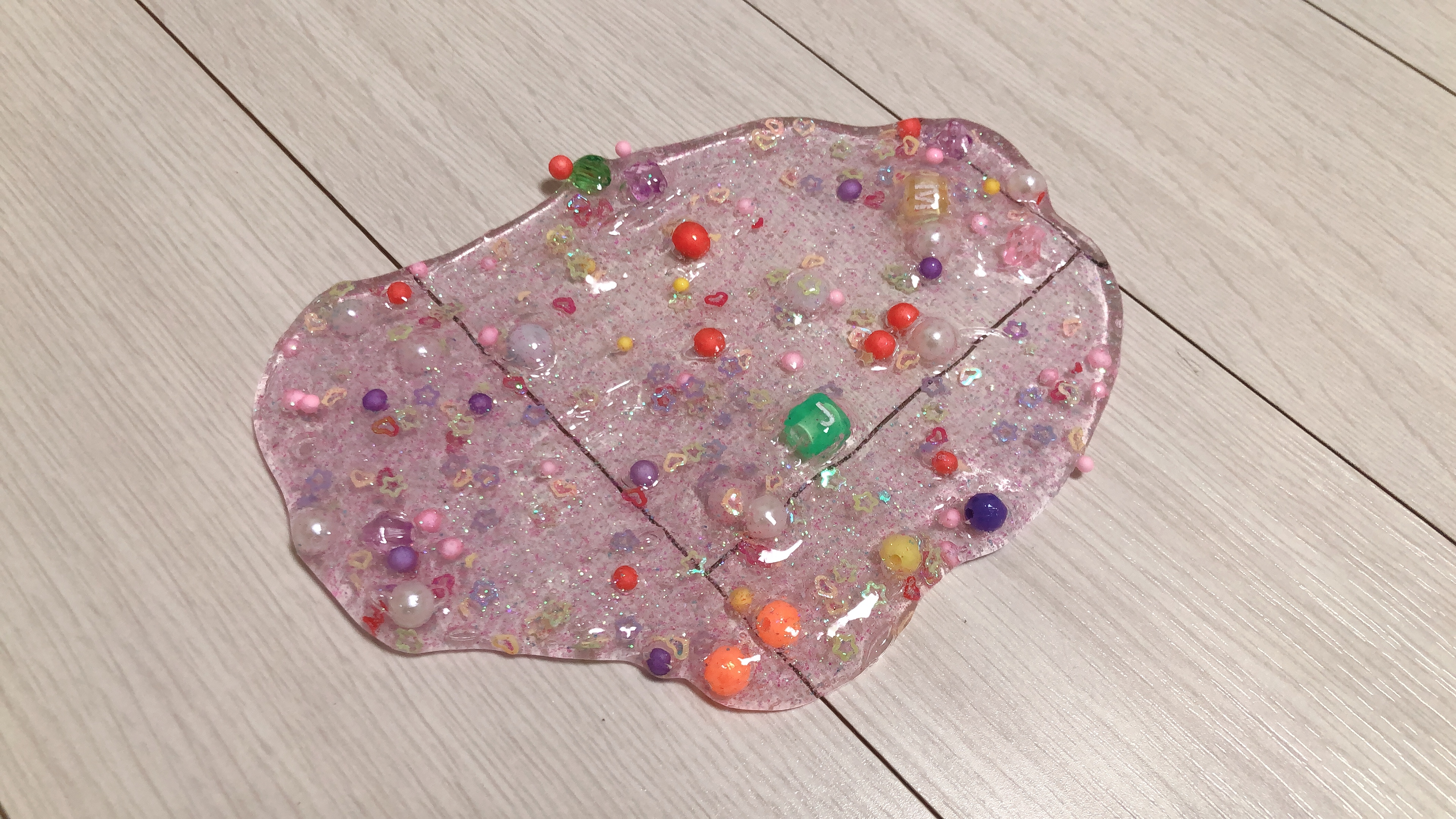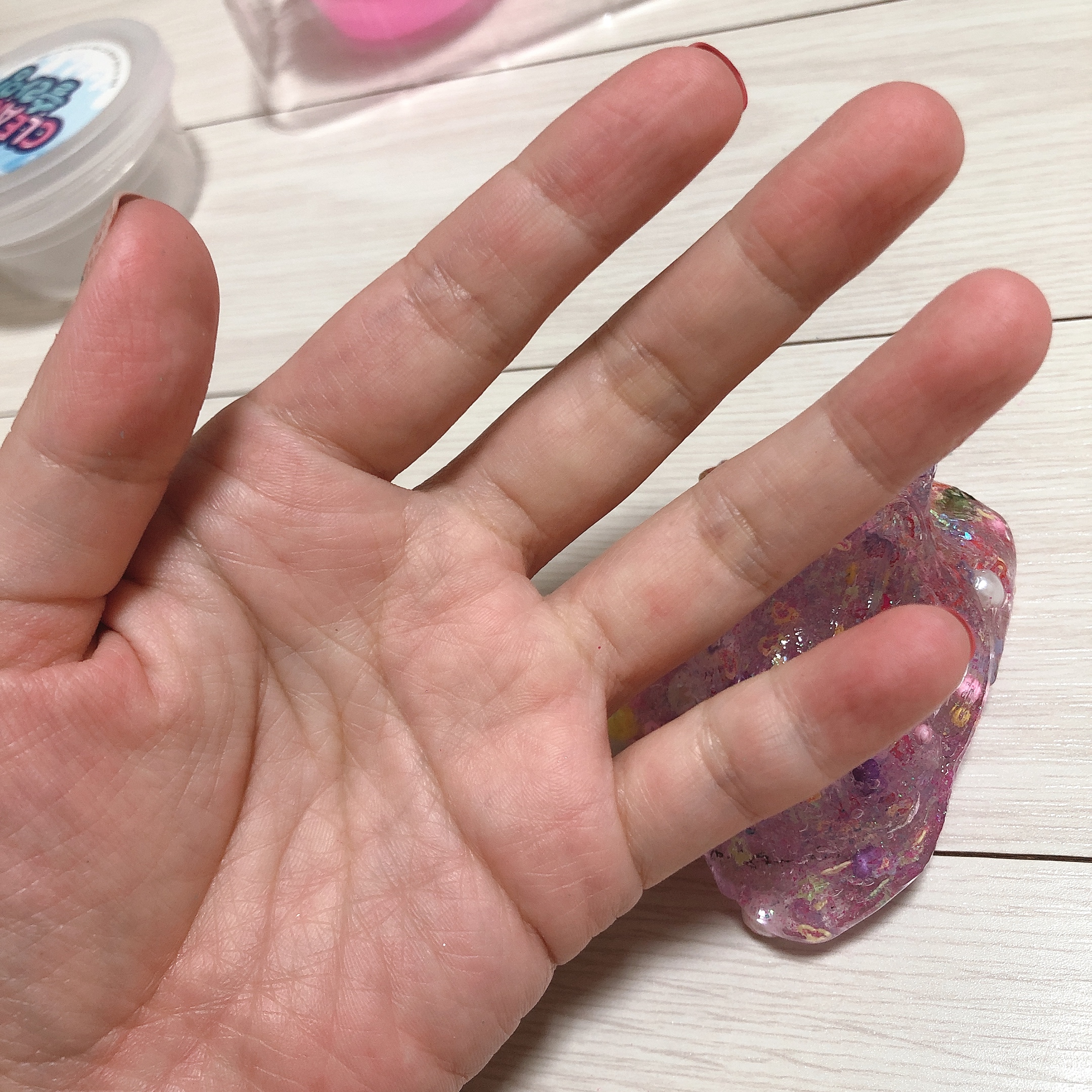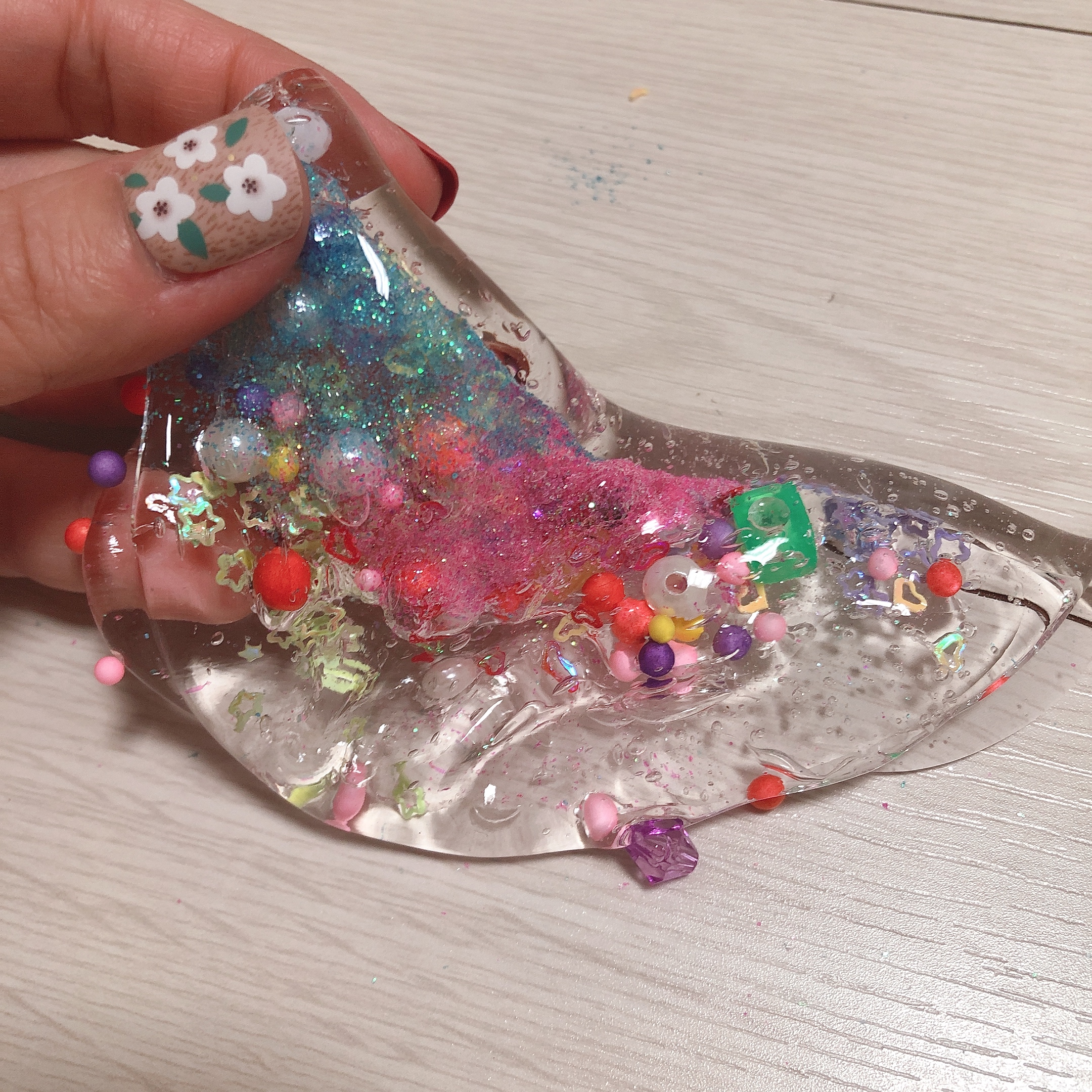 토핑을 다 넣고 나면 이제는 반죽하는 시간이다. 몇번 주물주물 했더니 금새 토핑이 예쁘게 섞였다. 투명한 슬라임에 글리터를 넣으면 해당 글리터의 색상으로 변하는 것도 재미있었다. 알갱이가 큰 토핑을 너무 많이 넣으면 가지고 놀면서 비즈가 밖으로 튕겨져 나가기도 한다. 끈적이지 않으니 그냥 주우면 된다.