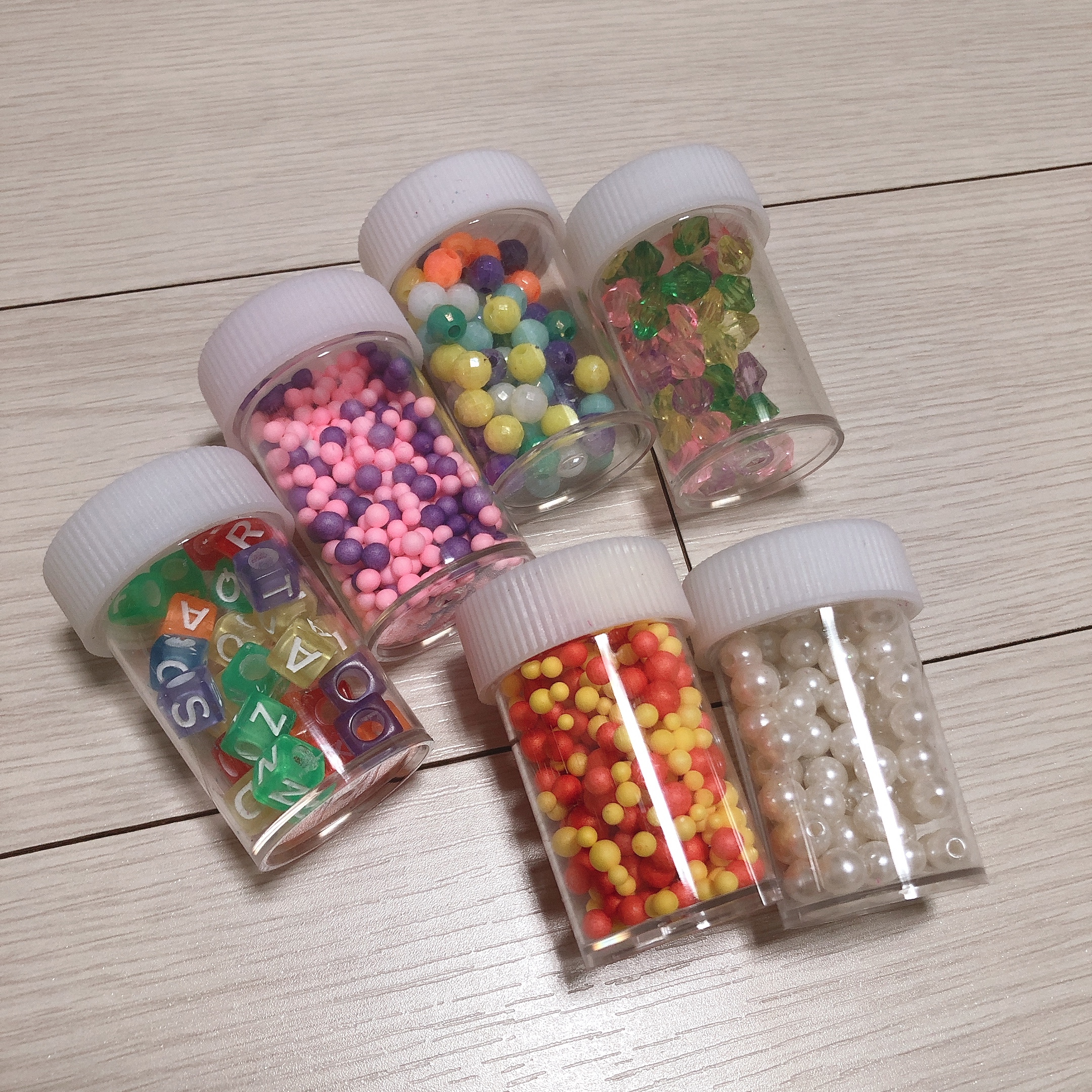 슬라임의 기본 재료가 되는 슬라임 액체(?)가 여섯통 들어있다. 분홍, 노랑, 파랑 색상이 각 1통씩이며 나머지는 투명하다. 그리고 컬러비즈, 스팽글, 글리터, 진주, 알파벳비즈, 컬러젤리(노랑/빨강/파랑) - 총 여섯가지의 비즈도 함께 들어있다.