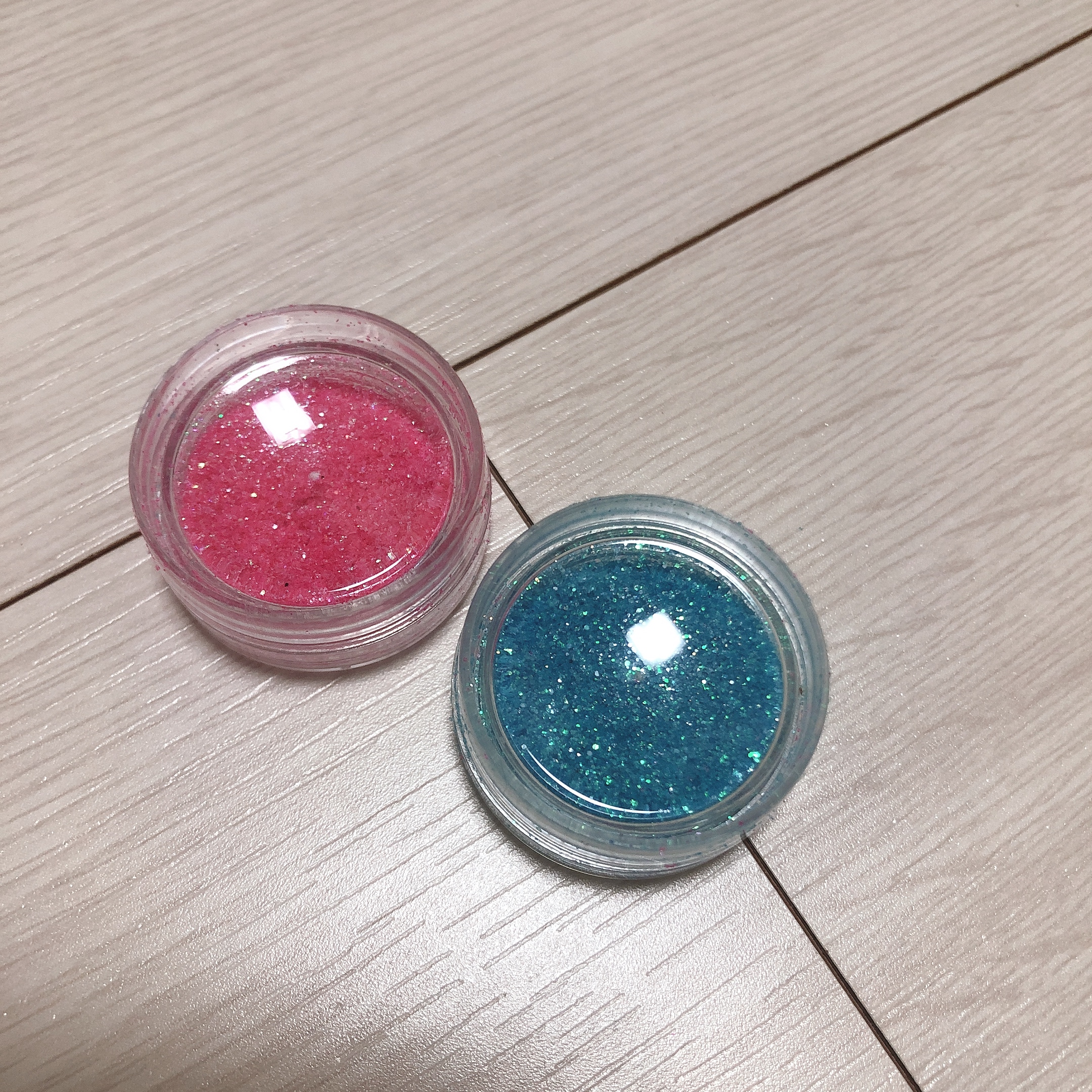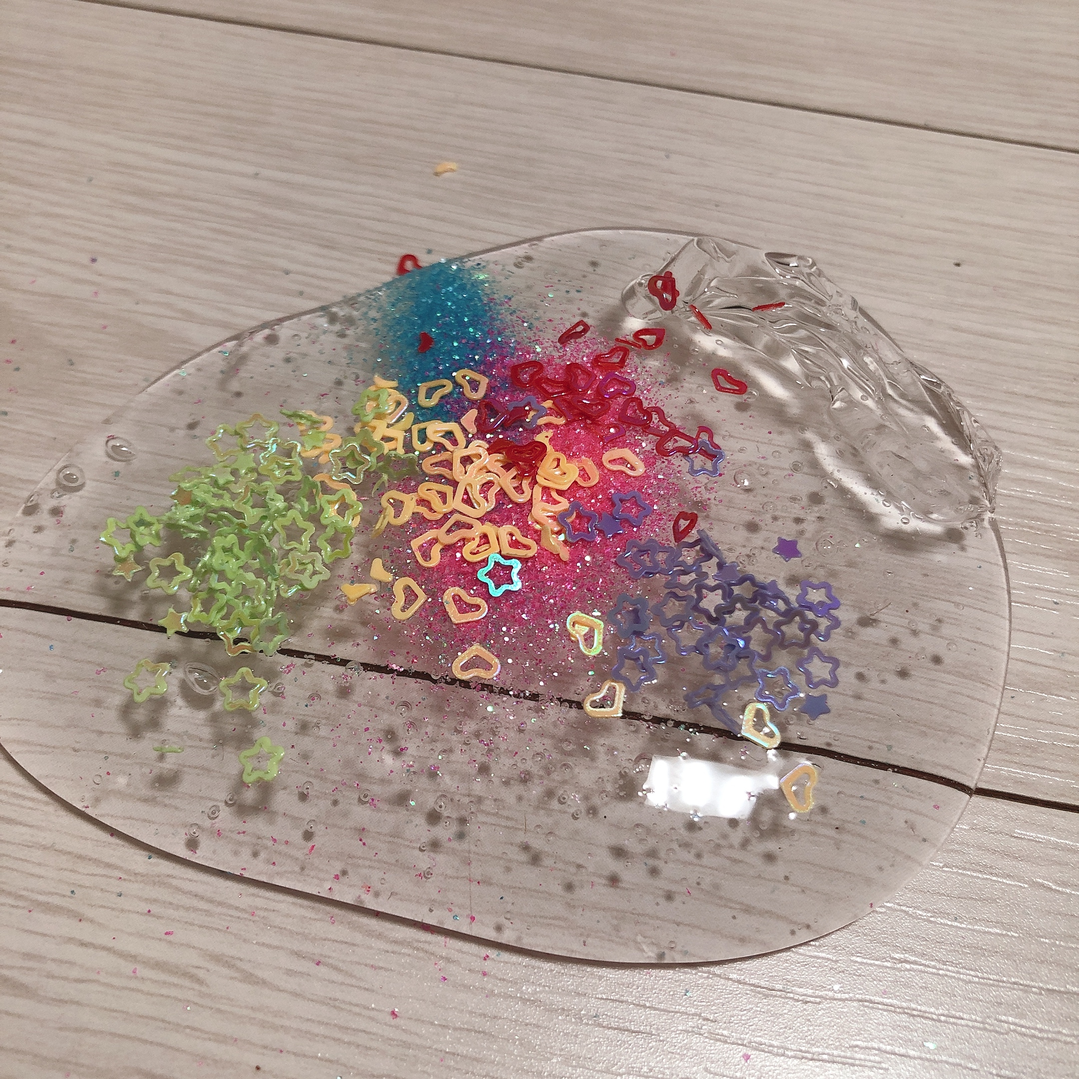 말랑말랑하고 쫀득한 슬라임을 바닥에 내려 놓았다. 가장 먼저 글리터를 넣었다. (이왕 해보는거 종류별로 다 넣어볼 계획)