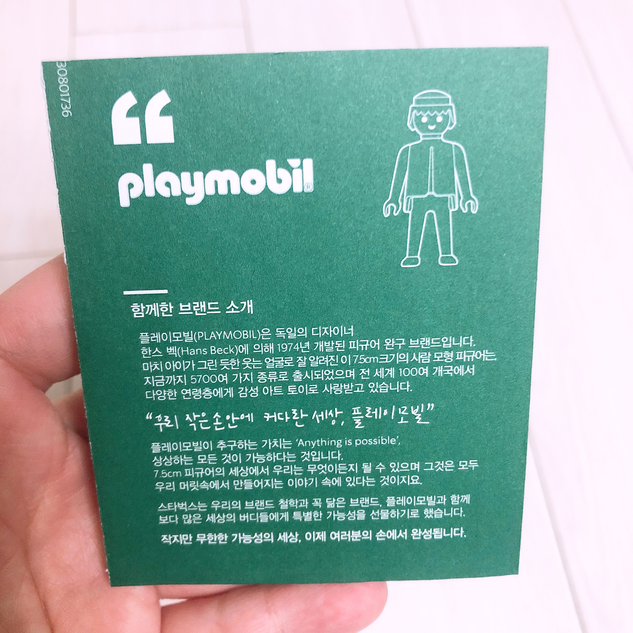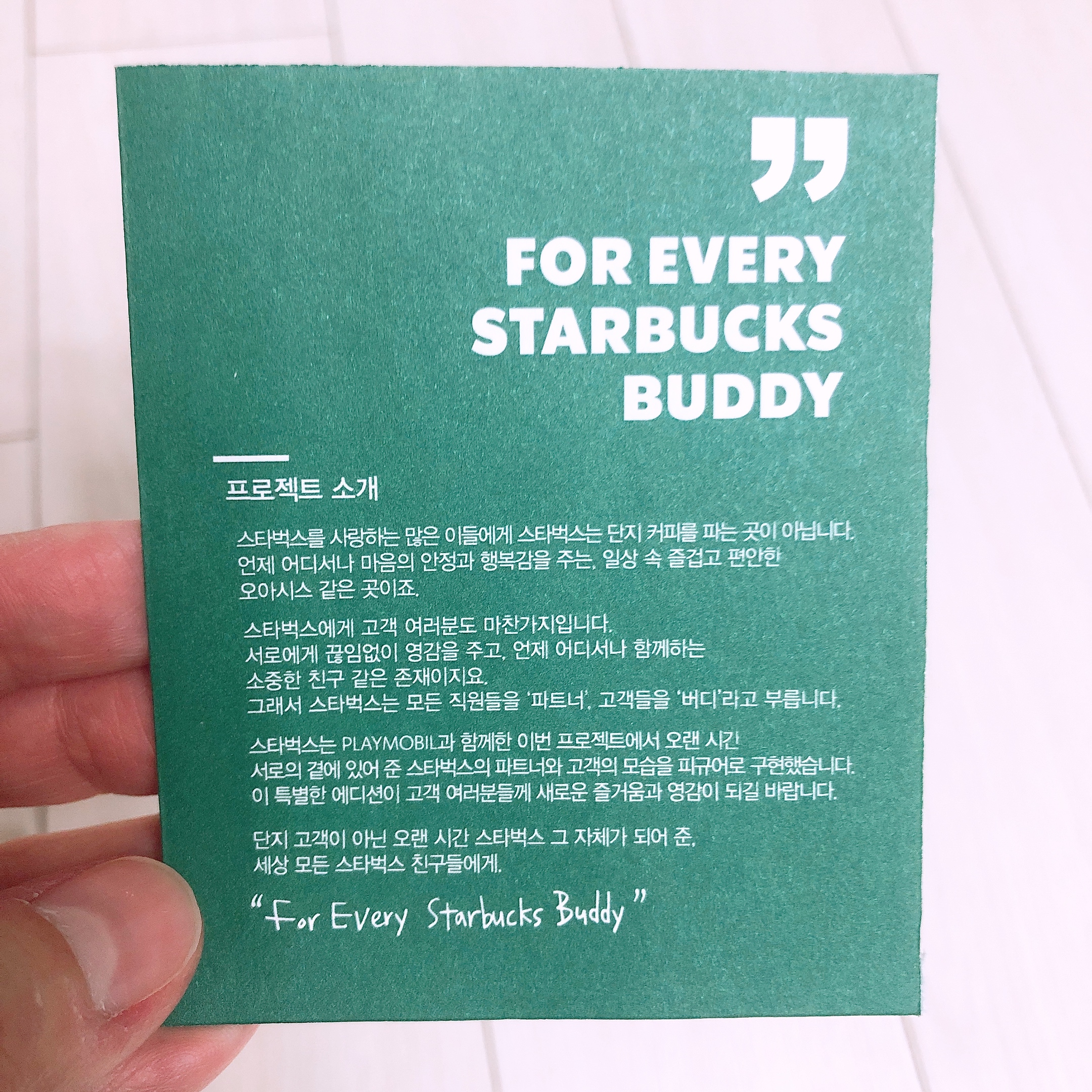 종이 표지에는 "For every starbucks buddy" 라는 문구와 함께 프로젝트 소개 & 함께한 브랜드인 플레이모빌 소개가 적혀 있으며, 안 쪽에는 컬러링을 할 수 있도록 피규어 스케치가 그려져 있다. 무려 실제 피규어와 똑같은 실물크기이다.